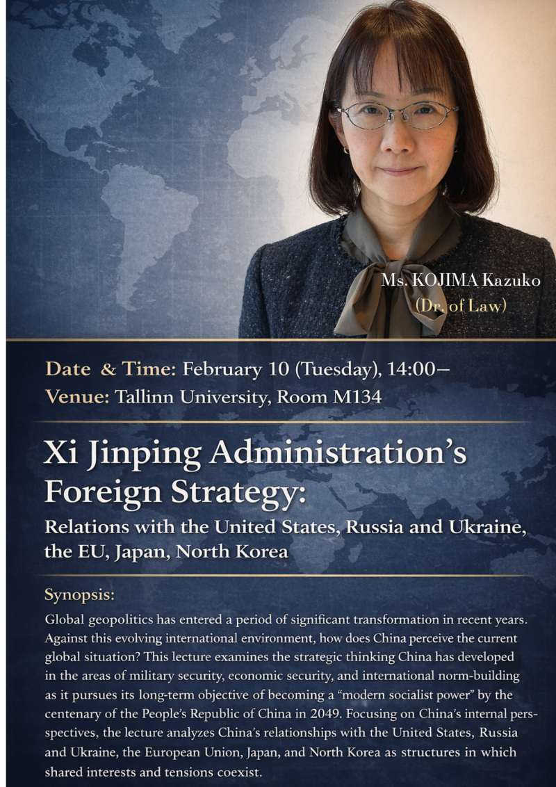 On Tuesday, February 10, Professor KOJIMA Kazuko from Keio University will hold the lecture “Xi Jinping Administration’s Foreign Strategy: Relations with the United States, Russia and Ukraine, the EU, Japan, North Korea” in Tallinn University.
