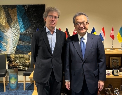 中村大使、ノム外交学校校長と意見交換 令和7年11月26日 11月26日、中村耕一郎大使は、エストニア外交学校を訪問し、エッケ・ノム校長と意見交換をしました。 大使とノム校長は、日本とエストニアの外交官育成制度や、将来の協力可能性などについて意見交換を行いました。