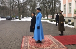 それから100年の歳月を経た今年の1月26日午前11時半、カリユライド大統領が北岡大使を大統領宮殿(カドリオルグ)に招待し、国旗掲揚のセレモニーを行って下さいました。